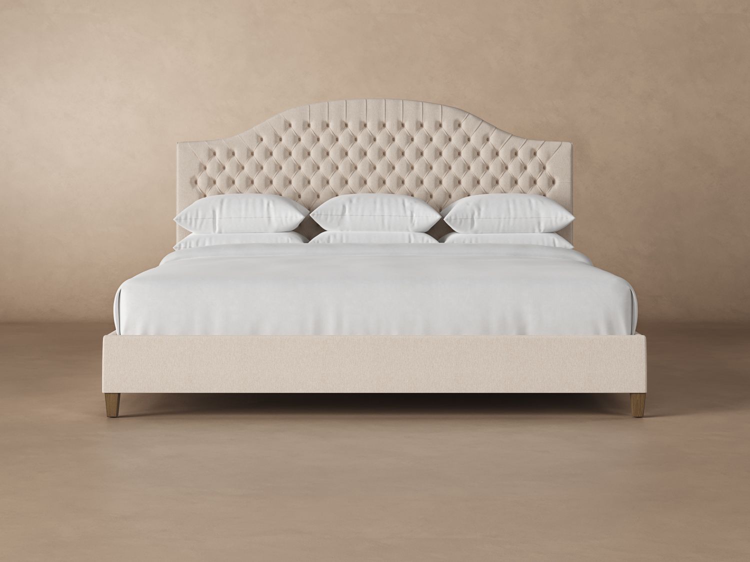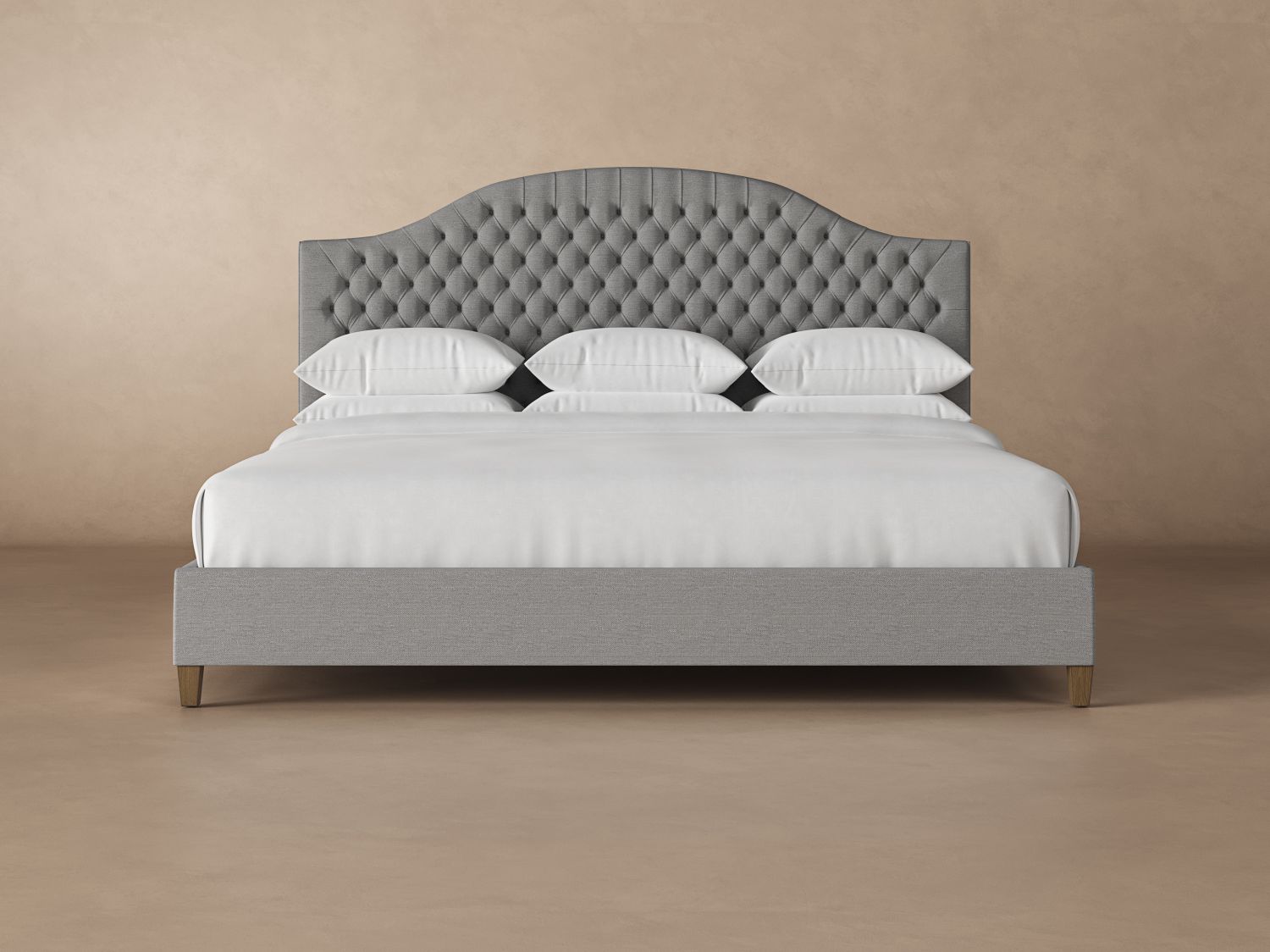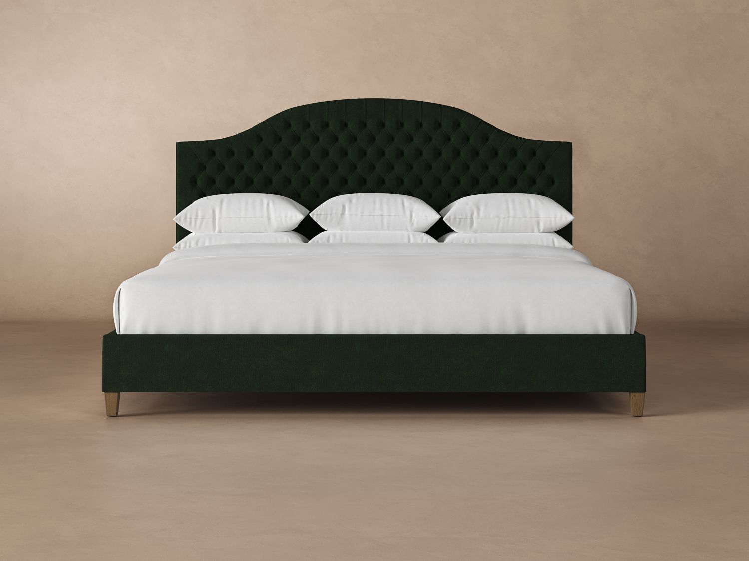 The Archie Deep Tufted Wyoming King bed frame offers a traditional design with an arched, diamond-tufted headboard. Each model is handcrafted to order, one by one, in our workshop in North Carolina. The base consists of poplar and maple hardwood, reinforced by dowels so that nothing pulls apart. That’s why our Archie bed frames offer incredible sturdiness and durability.